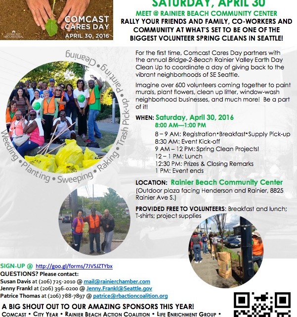 For the first time, Comcast Cares Day partners with the annual Bridge-2-Beach Rainier Valley Earth Day Clean Up to coordinate a day of giving back to the vibrant neighborhoods of SE Seattle. Imagine over 600 volunteers coming together to paint murals, plant flowers, clean up litter, window-wash neighborhood businesses, and much more! Be a part of it!