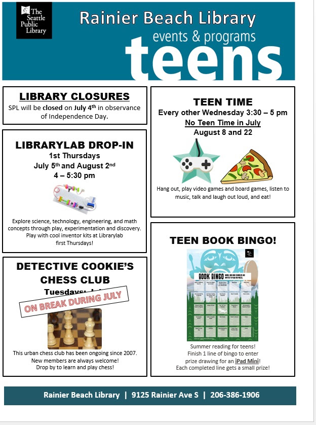 Rainier Beach Library Teen Events & Programs Jul 5, 2018 | Life-long Learning | 0 Download “Rainier Beach Library Teen Events & Programs” unnamed-17.jpg – Downloaded 981 times – 141.11 KB Related PostsJuly 12, 2016 RV COO Community Implementation StructureFebruary 28, 2022 Guaranteed Basic IncomeFebruary 18, 2010 Share your ideas for Othello neighborhood parks – Feb 20!April 8, 2010 2010 Summer Recreation Employment opportunities announced