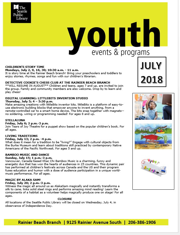 Rainier Beach Library Youth Events & Programs Jul 5, 2018 | Life-long Learning | 0 Download “Rainier Beach Library Youth Events & Programs” unnamed-16.jpg – Downloaded 1221 times – 156.64 KB Related PostsDecember 24, 2018 RBAC Spotlight: Rashad BarberOctober 31, 2016 Lifelong Learning Study Through Photovoice! Adults 25-35 Years of age WANTEDJune 23, 2016 Graduate Student Researchers NeededMay 5, 2010 Building Bridges to the Future, May 6